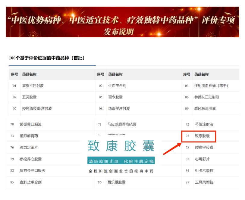 致康胶囊因其临床应用疗效可靠、安全性高、组方经典科学、生产标准严格以及大量循证医学证据等优势得以首批入选。